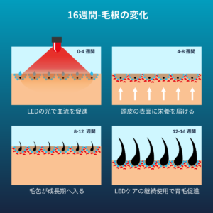 「赤色LED照射 → ミトコンドリアが活性化 → ATP増加 → 毛母細胞が活発に分裂・成長 → 育毛効果」