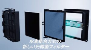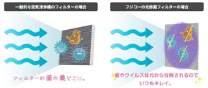 光除菌フィルターは、菌やウイルス、臭いとなるガス成分を「元から分解して除去」するため、