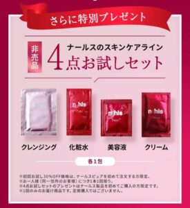 ナールスピュア単体だけでなく、クレンジング、美容液、クリームも試せるため、