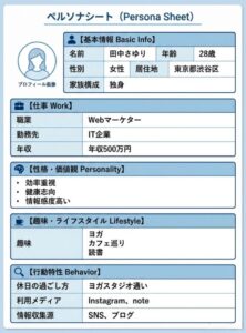 - ペルソナ:「28歳、都内勤務のマーケター、休日はヨガに通う」など一人の人物像
