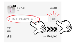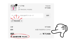 「クーポンコードまたはギフトカード」の部分に「TRIA2026」を入力します。
